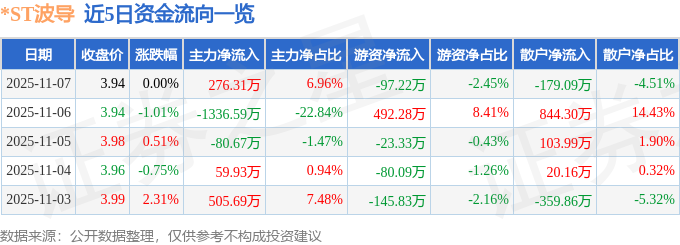 11月7日的资金流向数据方面,主力资金净流入276.31万元,占总成交额6.96%,游资资金净流出97.22万元,占总成交额2.45%,散户资金净流出179.09万元,占总成交额4.51%。