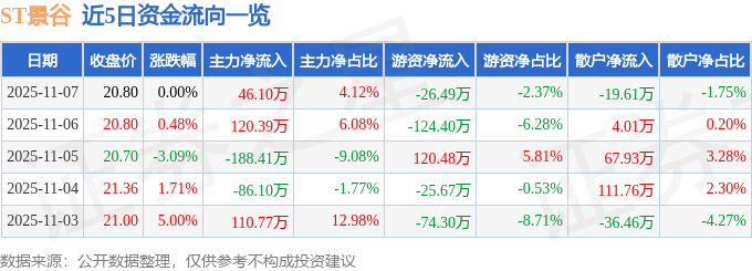 11月7日的资金流向数据方面,主力资金净流入46.1万元,占总成交额4.12%,游资资金净流出26.49万元,占总成交额2.37%,散户资金净流出19.61万元,占总成交额1.75%。