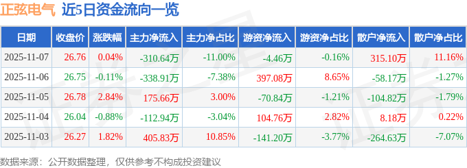 11月7日的资金流向数据方面,主力资金净流出310.64万元,占总成交额11.0%,游资资金净流出4.46万元,占总成交额0.16%,散户资金净流入315.1万元,占总成交额11.16%。