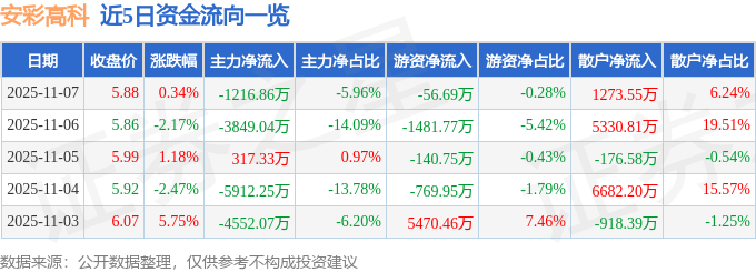 证券之星消息,截至2025年11月7日收盘,安彩高科(600207)报收于5.88元,上涨0.34%,换手率3.18%,成交量34.59万手,成交额2.04亿元。