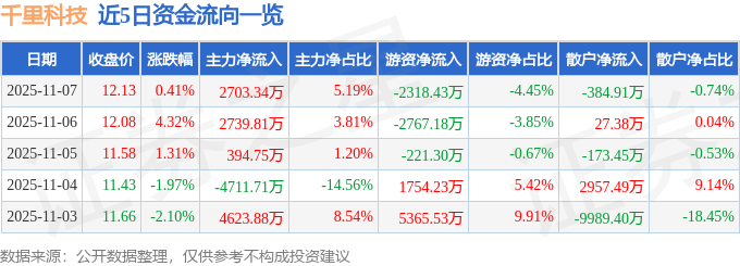 证券之星消息,截至2025年11月7日收盘,千里科技(601777)报收于12.13元,上涨0.41%,换手率0.95%,成交量42.84万手,成交额5.21亿元。
