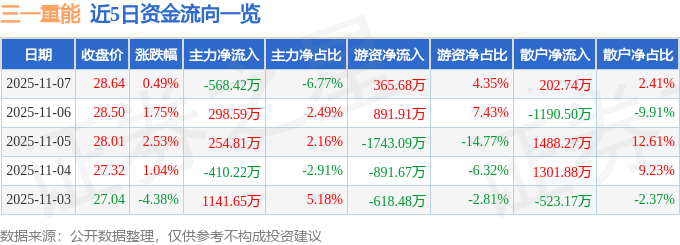 证券之星消息,截至2025年11月7日收盘,三一重能(688349)报收于28.64元,上涨0.49%,换手率1.19%,成交量2.95万手,成交额8398.82万元。