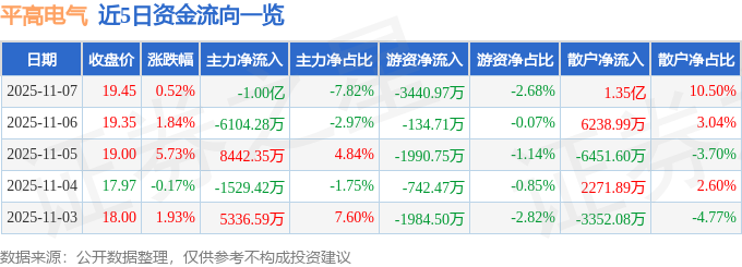证券之星消息,截至2025年11月7日收盘,平高电气(600312)报收于19.45元,上涨0.52%,换手率4.84%,成交量65.64万手,成交额12.83亿元。