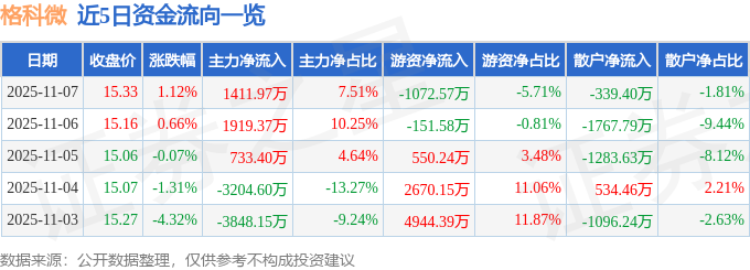 证券之星消息,截至2025年11月7日收盘,格科微(688728)报收于15.33元,上涨1.12%,换手率0.49%,成交量12.36万手,成交额1.88亿元。