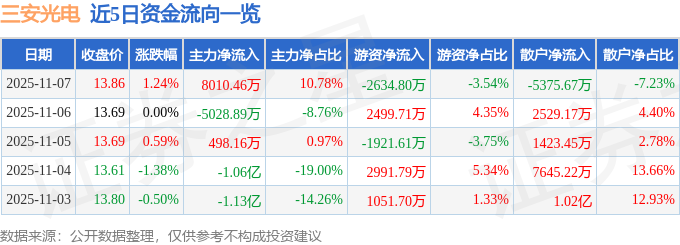 证券之星消息,截至2025年11月7日收盘,三安光电(600703)报收于13.86元,上涨1.24%,换手率1.08%,成交量53.92万手,成交额7.43亿元。