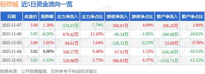 证券之星消息,截至2025年11月7日收盘,轻纺城(600790)报收于3.9元,上涨1.3%,换手率1.29%,成交量18.9万手,成交额7374.39万元。
