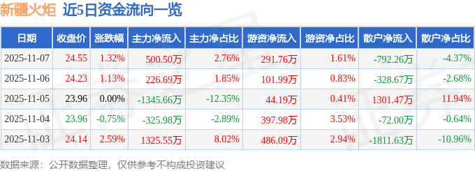 证券之星消息,截至2025年11月7日收盘,新疆火炬(603080)报收于24.55元,上涨1.32%,换手率5.19%,成交量7.34万手,成交额1.81亿元。