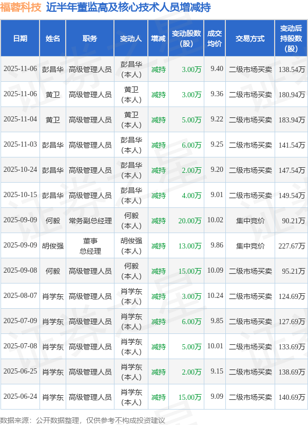 福蓉科技近半年内的董监高及核心技术人员增减持详情如下: