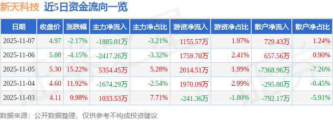 证券之星消息,截至2025年11月7日收盘,新天科技(300259)报收于4.97元,下跌2.17%,换手率9.89%,成交量115.7万手,成交额5.88亿元。