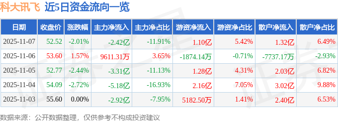 证券之星消息,截至2025年11月7日收盘,科大讯飞(002230)报收于52.52元,下跌2.01%,换手率1.76%,成交量38.48万手,成交额20.31亿元。