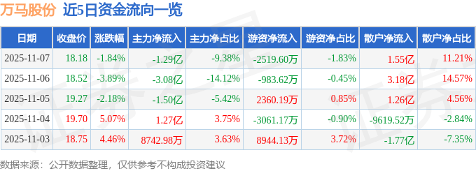 证券之星消息,截至2025年11月7日收盘,万马股份(002276)报收于18.18元,下跌1.84%,换手率7.42%,成交量74.72万手,成交额13.8亿元。