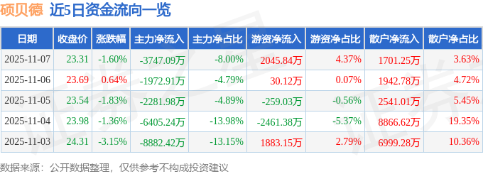 证券之星消息,截至2025年11月7日收盘,硕贝德(300322)报收于23.31元,下跌1.6%,换手率4.53%,成交量19.93万手,成交额4.69亿元。