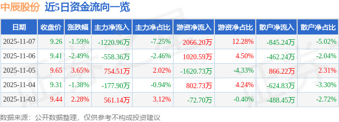 证券之星消息,截至2025年11月7日收盘,中辰股份(300933)报收于9.26元,下跌1.59%,换手率3.29%,成交量18.0万手,成交额1.68亿元。