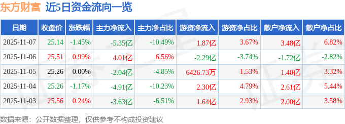证券之星消息,截至2025年11月7日收盘,东方财富(300059)报收于25.14元,下跌1.45%,换手率1.51%,成交量202.42万手,成交额50.98亿元。