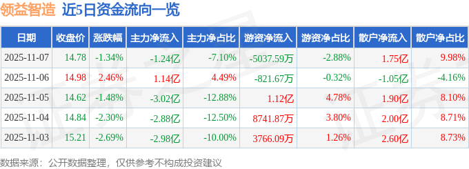 11月7日的资金流向数据方面,主力资金净流出1.24亿元,占总成交额7.1%,游资资金净流出5037.59万元,占总成交额2.88%,散户资金净流入1.75亿元,占总成交额9.98%。