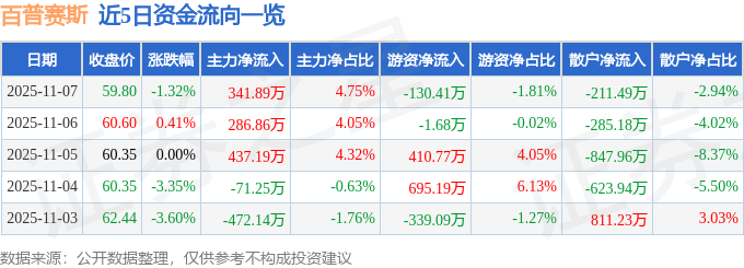 11月7日的资金流向数据方面,主力资金净流入341.89万元,占总成交额4.75%,游资资金净流出130.41万元,占总成交额1.81%,散户资金净流出211.49万元,占总成交额2.94%。