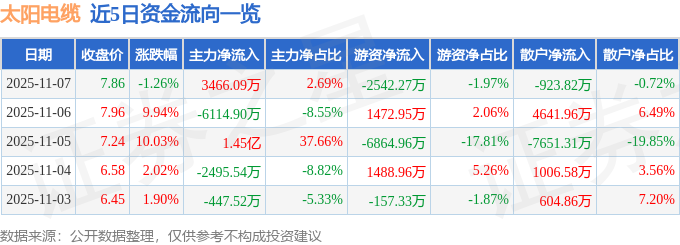 证券之星消息,截至2025年11月7日收盘,太阳电缆(002300)报收于7.86元,下跌1.26%,换手率22.84%,成交量164.96万手,成交额12.9亿元。