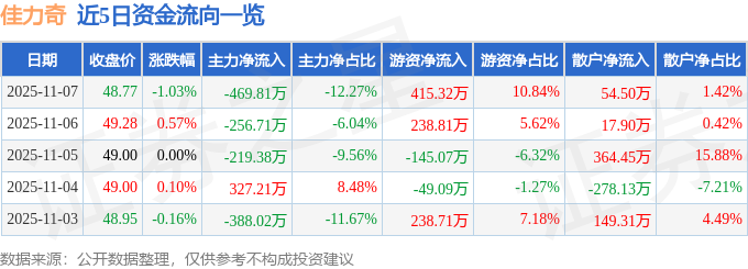 证券之星消息,截至2025年11月7日收盘,佳力奇(301586)报收于48.77元,下跌1.03%,换手率1.48%,成交量7844.0手,成交额3830.03万元。