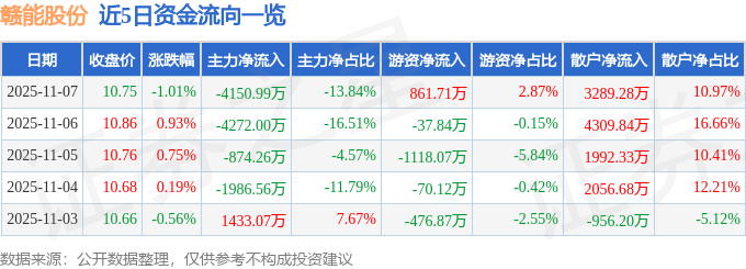 证券之星消息,截至2025年11月7日收盘,赣能股份(000899)报收于10.75元,下跌1.01%,换手率2.81%,成交量27.41万手,成交额3.0亿元。
