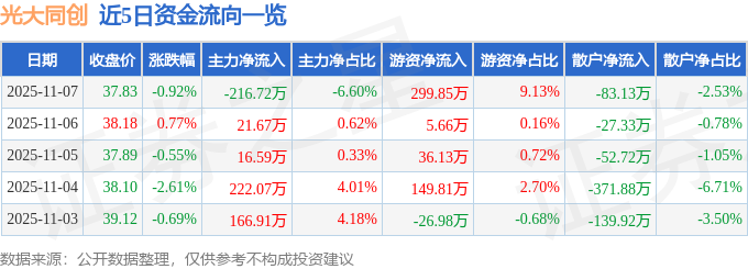 证券之星消息,截至2025年11月7日收盘,光大同创(301387)报收于37.83元,下跌0.92%,换手率2.03%,成交量8677.0手,成交额3283.57万元。