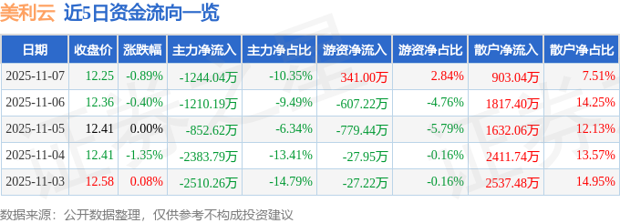 证券之星消息,截至2025年11月7日收盘,美利云(000815)报收于12.25元,下跌0.89%,换手率1.41%,成交量9.79万手,成交额1.2亿元。
