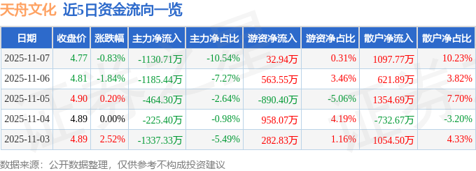 证券之星消息,截至2025年11月7日收盘,天舟文化(300148)报收于4.77元,下跌0.83%,换手率2.75%,成交量22.43万手,成交额1.07亿元。