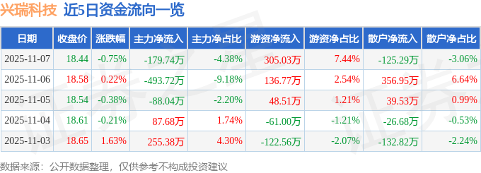 证券之星消息,截至2025年11月7日收盘,兴瑞科技(002937)报收于18.44元,下跌0.75%,换手率0.75%,成交量2.22万手,成交额4100.74万元。