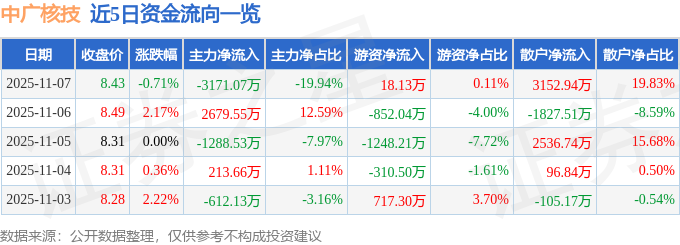 证券之星消息,截至2025年11月7日收盘,中广核技(000881)报收于8.43元,下跌0.71%,换手率2.23%,成交量18.81万手,成交额1.59亿元。