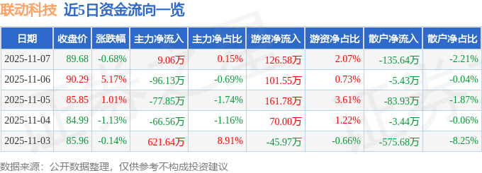 证券之星消息,截至2025年11月7日收盘,联动科技(301369)报收于89.68元,下跌0.68%,换手率1.88%,成交量6845.0手,成交额6126.2万元。
