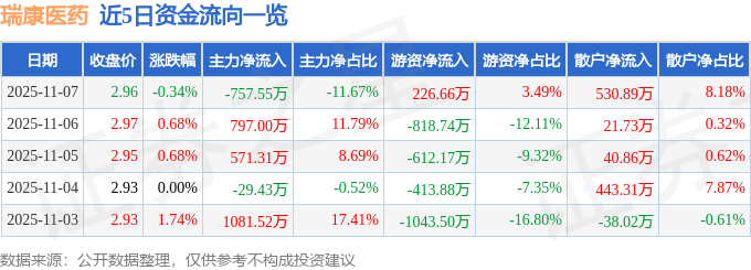 证券之星消息,截至2025年11月7日收盘,瑞康医药(002589)报收于2.96元,下跌0.34%,换手率1.6%,成交量21.91万手,成交额6492.28万元。