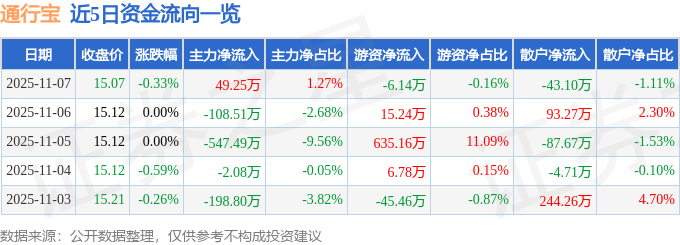 证券之星消息,截至2025年11月7日收盘,通行宝(301339)报收于15.07元,下跌0.33%,换手率1.54%,成交量2.58万手,成交额3891.95万元。