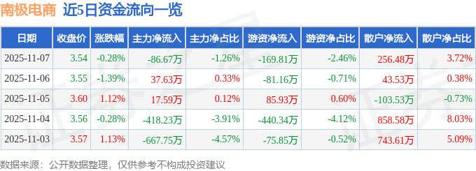 证券之星消息,截至2025年11月7日收盘,南极电商(002127)报收于3.54元,下跌0.28%,换手率0.98%,成交量19.46万手,成交额6899.06万元。