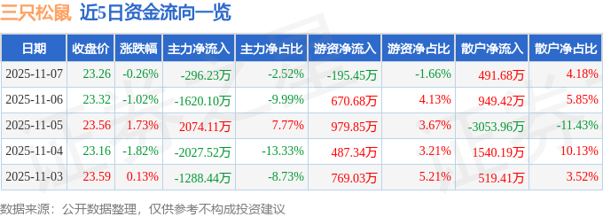 证券之星消息,截至2025年11月7日收盘,三只松鼠(300783)报收于23.26元,下跌0.26%,换手率1.8%,成交量5.04万手,成交额1.18亿元。