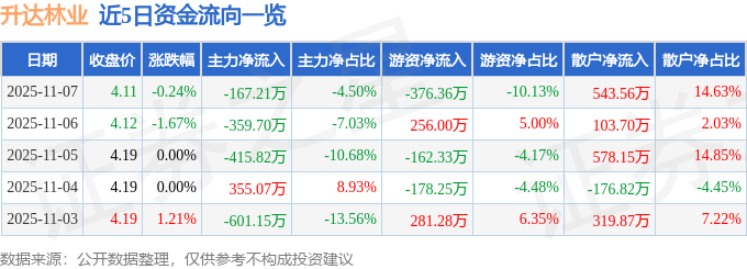 证券之星消息,截至2025年11月7日收盘,升达林业(002259)报收于4.11元,下跌0.24%,换手率1.19%,成交量8.98万手,成交额3715.59万元。