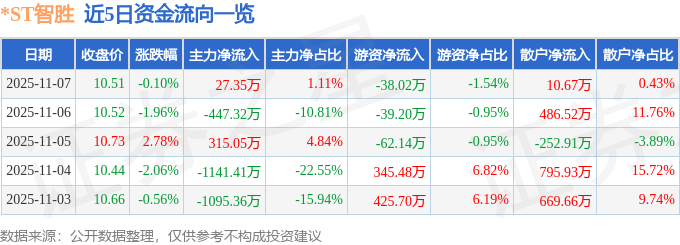 证券之星消息,截至2025年11月7日收盘,*ST智胜(002253)报收于10.51元,下跌0.1%,换手率1.13%,成交量2.35万手,成交额2472.04万元。