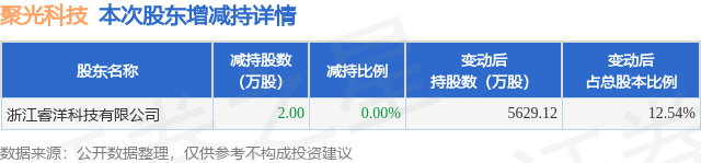 证券之星消息,11月7日聚光科技发布公告《聚光科技:关于控股股东被动减持实施完成的公告》,其股东浙江睿洋科技有限公司于2025年8月14日至2025年11月7日间合计减持2.0万股,占公司目前总股本的0.0045%,变动期间该股股价下跌19.42%,截止11月7日收盘报16.43元。