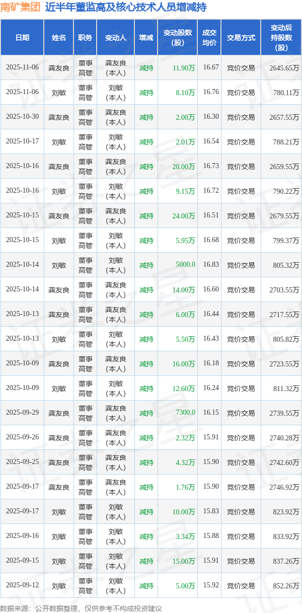 南矿集团近半年内的董监高及核心技术人员增减持详情如下: