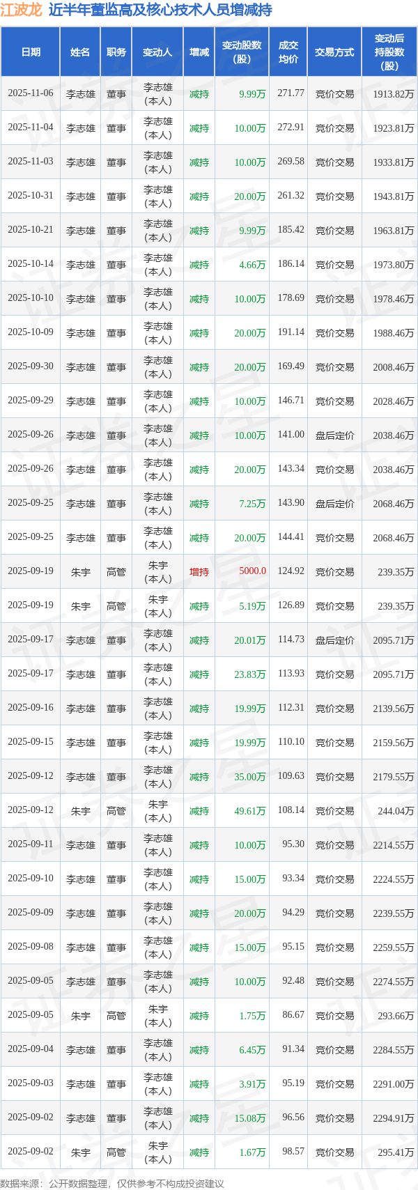 江波龙近半年内的董监高及核心技术人员增减持详情如下: