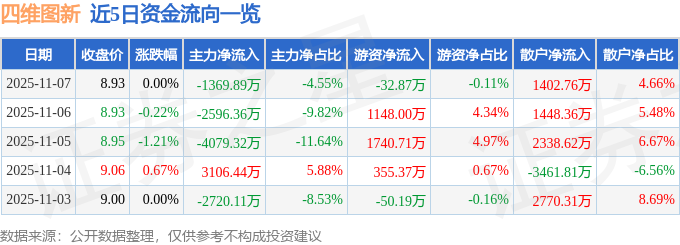 11月7日的资金流向数据方面,主力资金净流出1369.89万元,占总成交额4.55%,游资资金净流出32.87万元,占总成交额0.11%,散户资金净流入1402.76万元,占总成交额4.66%。