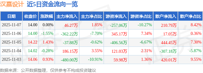 证券之星消息,截至2025年11月7日收盘,汉嘉设计(300746)报收于14.0元,上涨0.0%,换手率0.8%,成交量1.79万手,成交额2503.06万元。