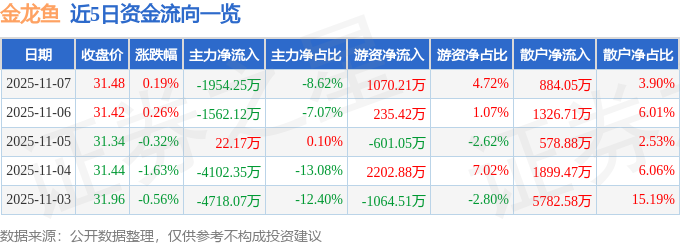 11月7日的资金流向数据方面,主力资金净流出1954.25万元,占总成交额8.62%,游资资金净流入1070.21万元,占总成交额4.72%,散户资金净流入884.05万元,占总成交额3.9%。