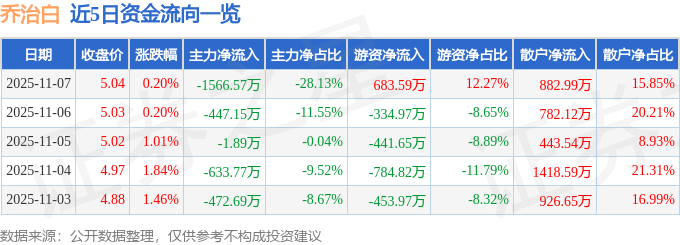11月7日的资金流向数据方面,主力资金净流出1566.57万元,占总成交额28.13%,游资资金净流入683.59万元,占总成交额12.27%,散户资金净流入882.99万元,占总成交额15.85%。