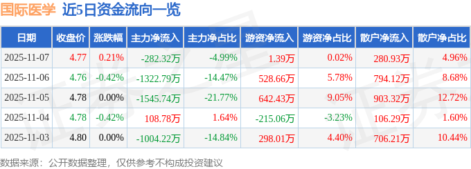 证券之星消息,截至2025年11月7日收盘,国际医学(000516)报收于4.77元,上涨0.21%,换手率0.54%,成交量11.88万手,成交额5661.3万元。