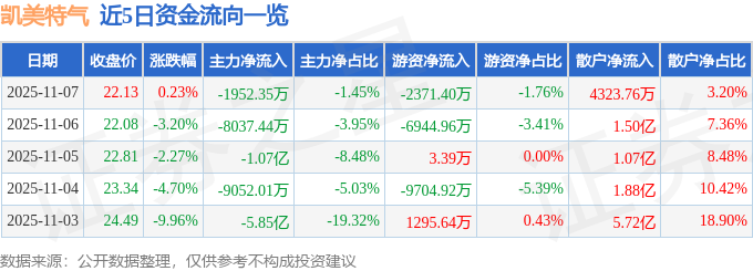 证券之星消息,截至2025年11月7日收盘,凯美特气(002549)报收于22.13元,上涨0.23%,换手率8.76%,成交量60.64万手,成交额13.5亿元。