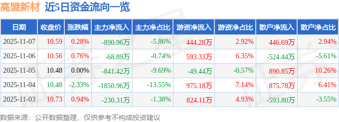 证券之星消息,截至2025年11月7日收盘,高盟新材(300200)报收于10.59元,上涨0.28%,换手率3.4%,成交量14.39万手,成交额1.52亿元。