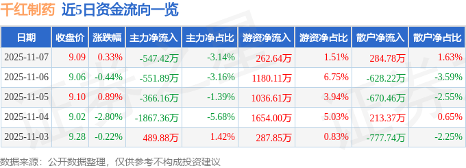 证券之星消息,截至2025年11月7日收盘,千红制药(002550)报收于9.09元,上涨0.33%,换手率2.04%,成交量19.19万手,成交额1.74亿元。