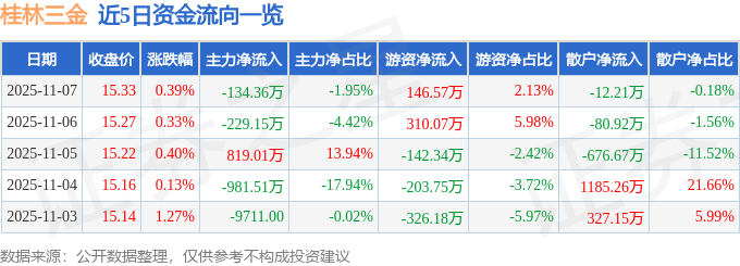 证券之星消息,截至2025年11月7日收盘,桂林三金(002275)报收于15.33元,上涨0.39%,换手率0.8%,成交量4.49万手,成交额6892.44万元。