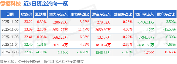 证券之星消息,截至2025年11月7日收盘,德福科技(301511)报收于33.22元,上涨0.39%,换手率8.01%,成交量30.01万手,成交额9.95亿元。
