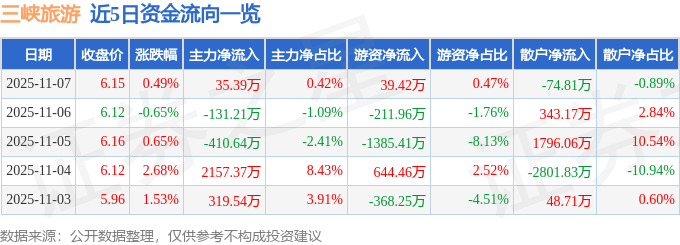 证券之星消息,截至2025年11月7日收盘,三峡旅游(002627)报收于6.15元,上涨0.49%,换手率1.9%,成交量13.62万手,成交额8368.61万元。