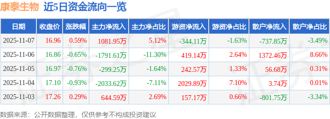 证券之星消息,截至2025年11月7日收盘,康泰生物(300601)报收于16.96元,上涨0.59%,换手率1.38%,成交量12.45万手,成交额2.11亿元。